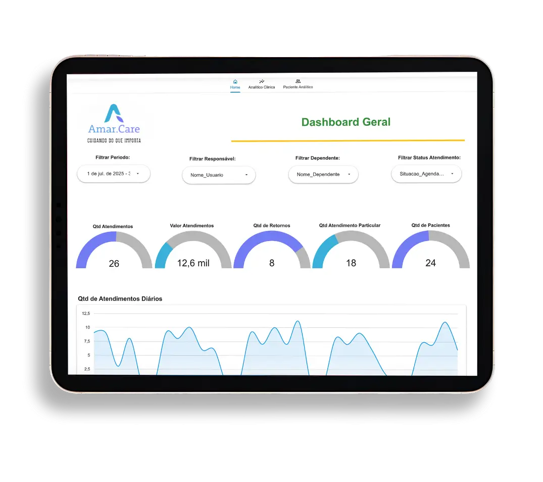 Um painel robusto para acompanhar atendimentos, finanças e performance — com dados em tempo real e relatórios personalizados.